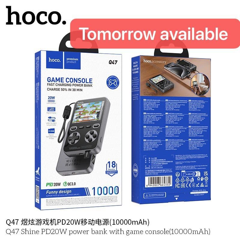 Hoco Q47 Power Bank + Game Console বৈশিষ্ট্য:2-ইন-1 ডিজাইন: পোর্টেবল বিনোদন এবং চার্জিংয়ের জন্য একটি 10000mAh পাওয়ার ব্যাংকের সাথে একটি হ্যান্ডহেল্ড গেমিং কনসোল একত্রিত করে।