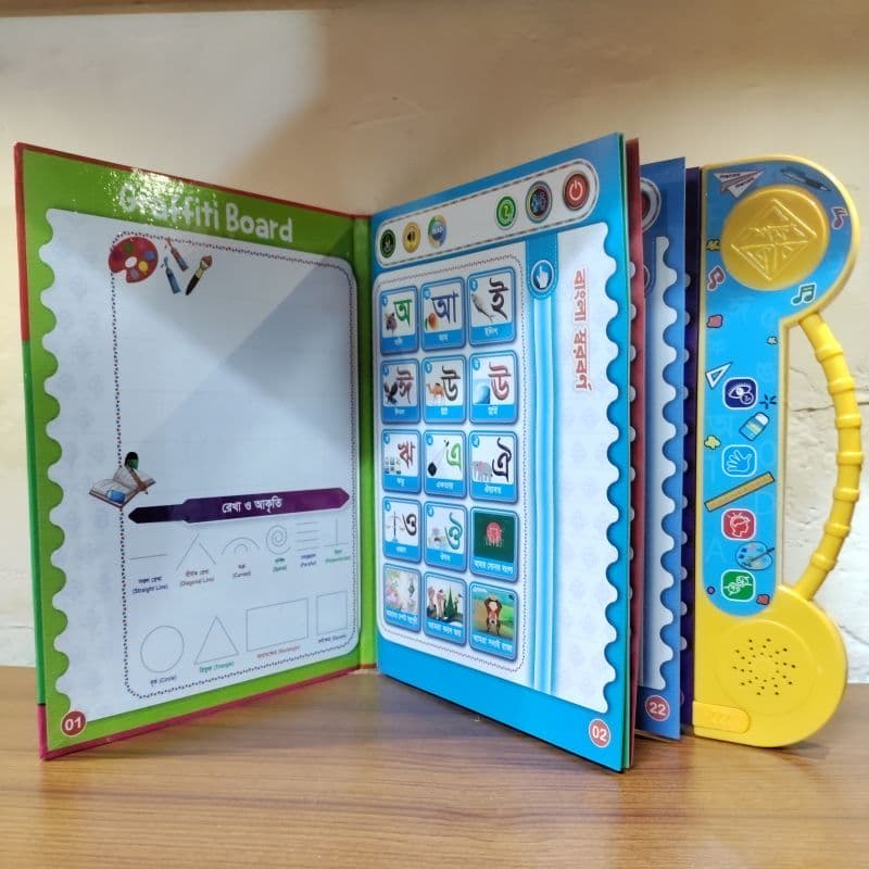 Intelligence Talking Book For Kids 52+ Content প্রধান বৈশিষ্ট্যসমূহ:এতে বাংলা, ইংরেজি ও আরবি বর্ণমালা এবং সংখ্যা শেখার সুযোগ আছে ।নারী ও পুরুষ উভয়ের কণ্ঠস্বর (Dual Voice) থাকে।বইটিতে বর্ণমালা (স্বরবর্ণ, ব্যঞ্জনবর্ণ, Alphabet), সংখ্যা, ফল, ফুল, প্রাণী, শরীরের অঙ্গপ্রত্যঙ্গ, ছোট সূরা, দোয়া ও গজল শোনার সু্যোগ আছে ।ইন্টারেক্টিভ টাচ সিস্টেম: বইয়ের কোনো ছবি বা লেখাতে চাপ দিলে সেটি স্পষ্ট শব্দে উচ্চারণ করে, যা শিশুদের উচ্চারণ এবং শব্দভাণ্ডার বাড়াতে সাহায্য করে।এটাতে লেখার জন্য একটা কলম থাকে, যার সাথে রাবার আছে যার ফলে লেখা গুলো সহজে মোছা যায়।রিচার্জেবল: রিচার্জেবল সুবিধা আছে, যা ব্যাটারি পরিবর্তনের ঝামেলা কমায়। সুবিধাঃসহজ ও মজাদার শিক্ষা: এটি শেখাকে খেলার মতো মজার করে তোলে এবং শিশুদের মনোযোগ ধরে রাখতে সাহায্য করে।উচ্চারণ অনুশীলন: সঠিক উচ্চারণ শুনতে পাওয়ায় শিশুদের ভাষার দক্ষতা বৃদ্ধি পায়।মস্তিষ্কের বিকাশ: রঙিন ছবি, শব্দ এবং কুইজ ফাংশন থাকার কারণে এটি শিশুদের মনোযোগ, স্মৃতিশক্তি এবং সৃজনশীলতা বাড়াতে সহায়তা করে।স্ব-শিক্ষণ (Self-Learning): শিশুরা নিজে নিজে শিখতে উৎসাহিত হয়।এটি একটি All-in-One ধরনের খেলনা-কাম-শিক্ষণ উপকরণ যা প্রিস্কুল বা প্রাথমিক স্তরের শিশুদের জন্য খুবই কার্যকর।