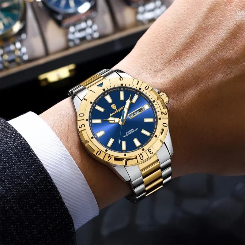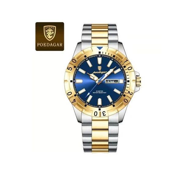 Gender: MenWatch Colour: Gold Green, Two Tone Gold, Silver Green, Silver BlueColour Quality: High Quality Electroplating Colour Watch Condition: Full Brand New Intact WatchBrand Name: POEDAGARModel Number: 959Place of Origin: Guangdong, ChinaMovement: Quartz, Japan MovementFeature: Day & Date, LuminousDial Window Material Type: Hardlex Crystal Clear Coated Glass Dial Diameter: 42mmCase Shape: RoundBand Width: 21mmBand Length: 20cmWatch Weight: Around 125gm ApproxClasp Type: Push Button Hidden Clasp (Butterfly Push Lock)Water Resistance Depth: 30m (Can Wash Without Any Doubt)Case Thickness: 11mmType: CHARM, Fashion, Luxury, sport, BusinessBand Material Type: Stainless steelCase Material: Stainless SteelDial Display: Pointer Single Index