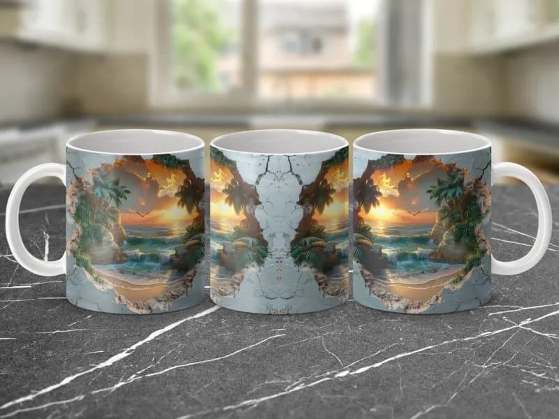 Attractive 3D Design Mug* Dimensions: 3.8" H x 3.2" D* Dishwasher and microwave safe* Wraparound design for a visually stunning mug* Strong, ceramic construction* Meets FDA requirements for food and beverage safety* Including protected packaging